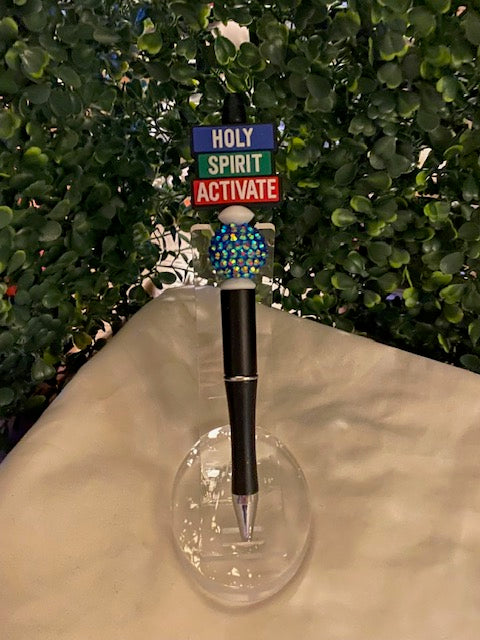 A red, green and blue bead with "Holy Spirit Activate" on it and a dark blue rhinestone bead on a black pen. Will ship with one ink refill.