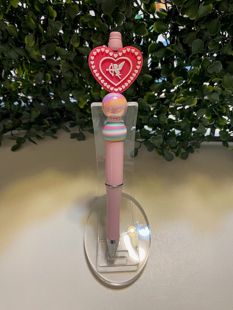 A large pink heart with a cupid in the middle with a shiny pink bead and a multicolored striped bead on a light pink pen. Will ship with one ink refill.